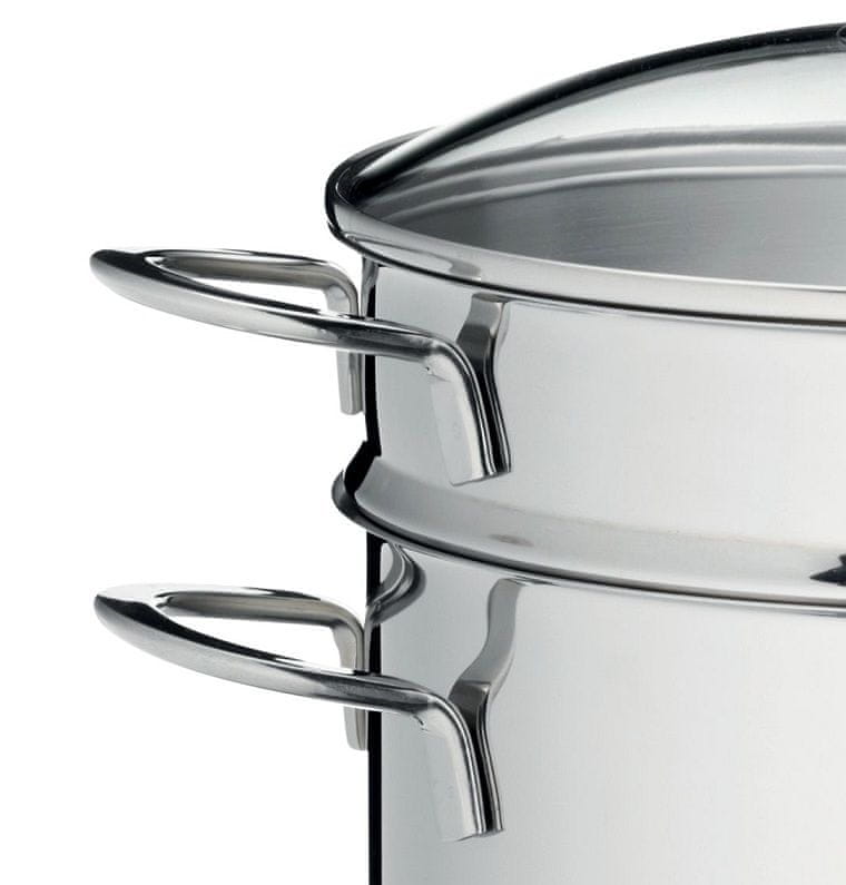 - material: nerjavno jeklo 18/10– premer: 24 cm- prostornina: 5,5 l- višina: 20 cm- višina s pokrovom: 28 cm- sestava: lonec, vložek za kuhanje v pari, stekleni pokrovLuksuzurni lonci in ponve nemške znamke KELA, …