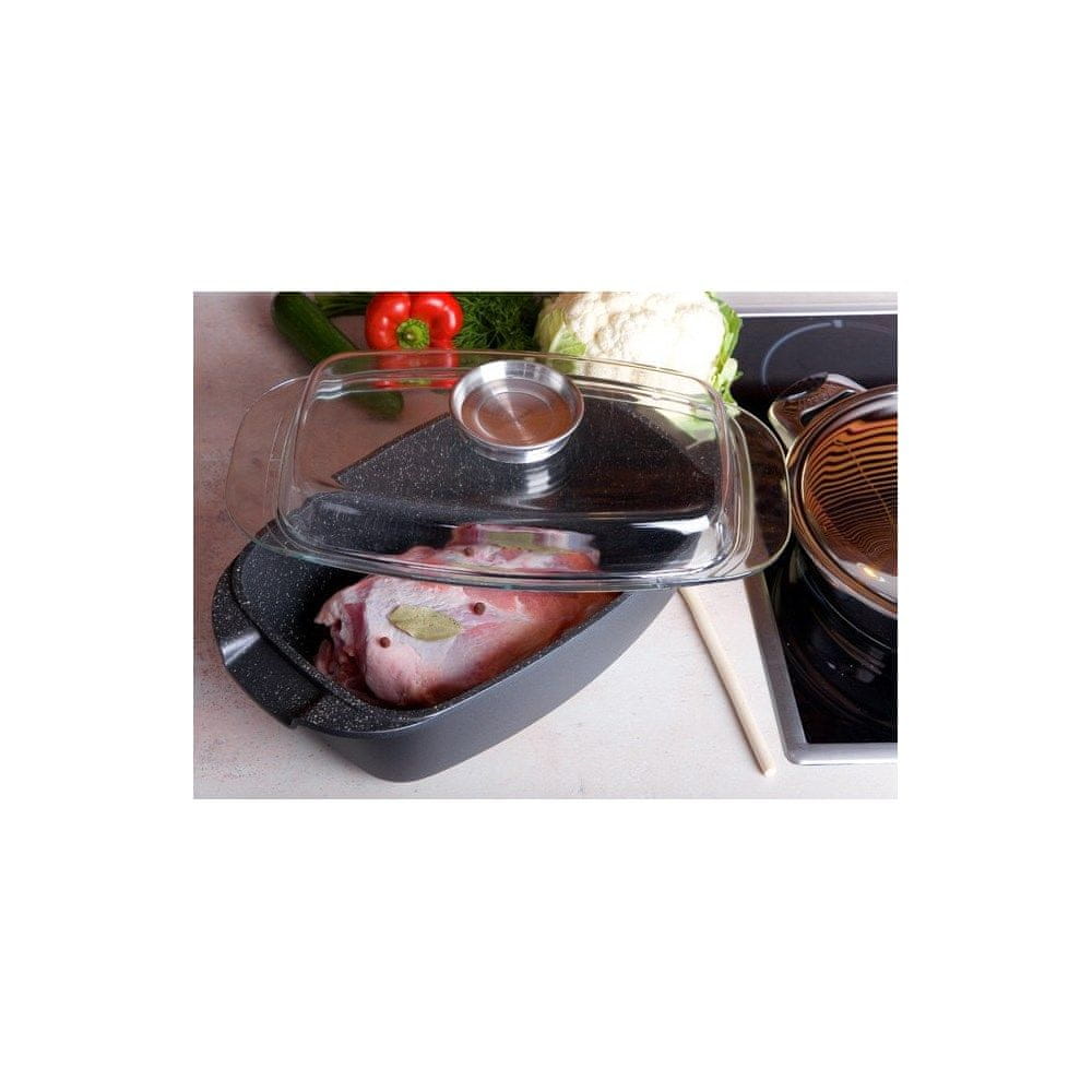 Primeren za vse vrste štedilnikov, razen za indukcijo. Zahvaljujoč inovativnemu ročaju Aroma Knob lahko samodejno dozirate olje ali olivno olje, npr. aromatizirano olje, v pekač. Zahvaljujoč temu bo jed sočna in se ne bo zažgala.