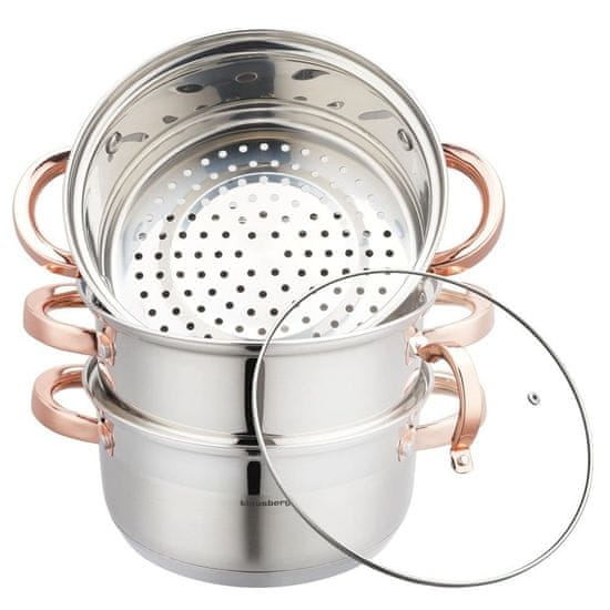 4-delni komplet parnih loncev KLAUSBERG, ki temelji na loncu s prostornino 3,1 l / Ø20 cm. Komplet je izdelan iz visokokakovostnega nerjavečega jekla. Uporabljeno jeklo je sestavljeno iz najkakovostnejše zlitine, ki se običajno uporablja v izdelkih svetovnega razreda, kar zagotavlja visoko odpornost proti koroziji in zelo dobro vzdržljivost. Uporabljeni material omogoča hitro segrevanje hrane in dolgo časa ohranja toploto.