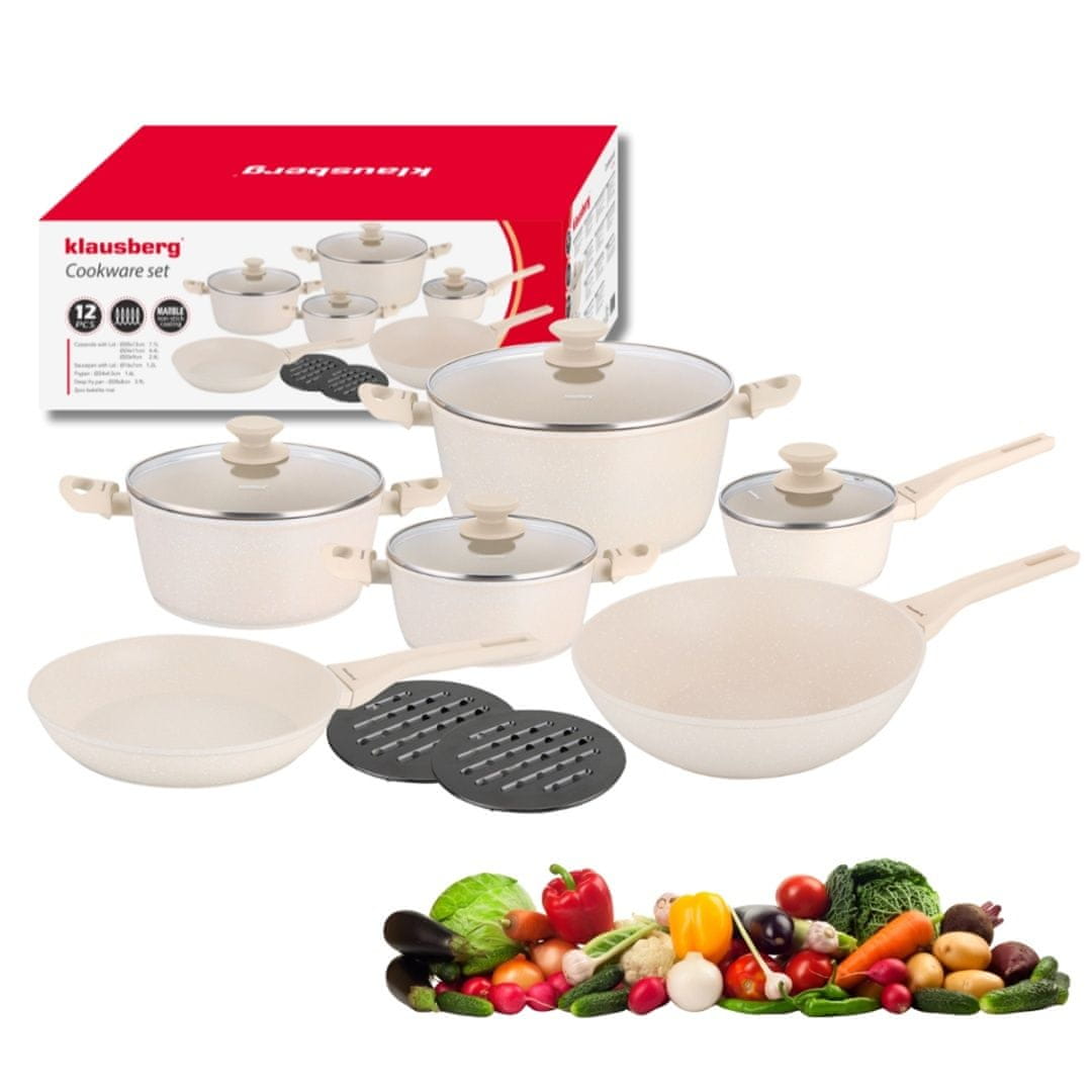Komplet Klausberg KB-7959 je popoln 12-delni komplet loncev in ponev, ki bo zadovoljil potrebe vsake kuhinje – od vsakodnevnega kuhanja do priprave zahtevnejših jedi. Izdelan je iz litega aluminija z marmornim premazom proti prijemanju , kar zagotavlja enakomerno segrevanje, enostavno čiščenje in udobno delovanje proti prijemanju.
