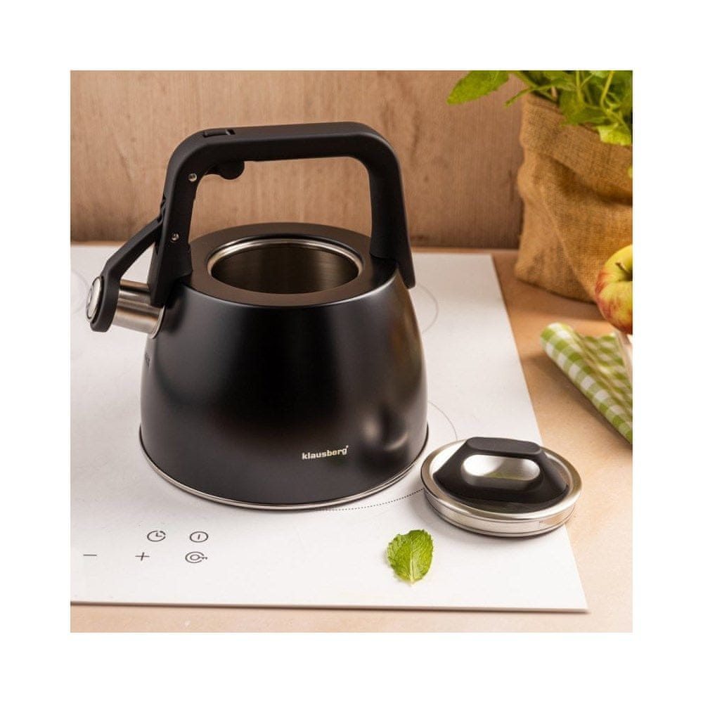 Ta eleganten tradicionalni grelnik vode s piščalko v črni barvi je sodoben dodatek, ki v vsako kuhinjo vnese eleganco. Njegova mat površina v kombinaciji z detajli iz nerjavečega jekla mu daje edinstven značaj. Odlično za vsakodnevno uporabo, pa tudi za serviranje toplih napitkov družini ali gostom.