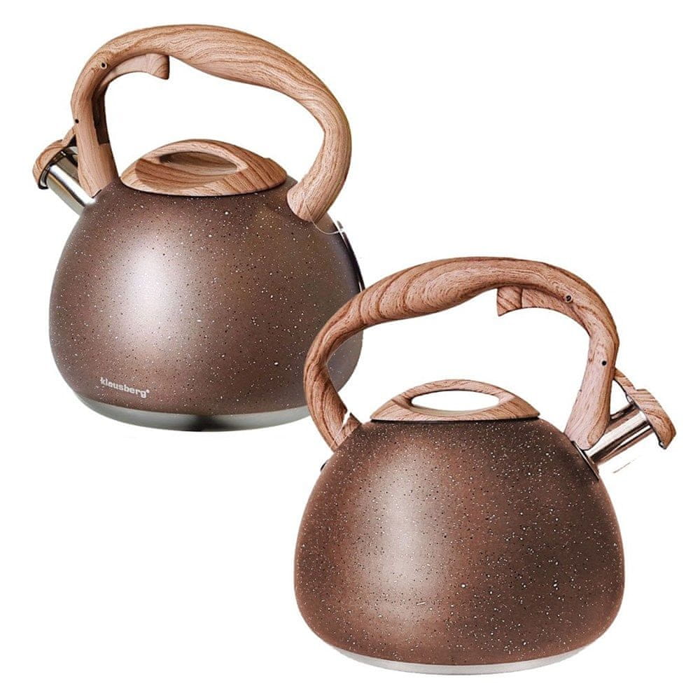 Jeklen grelnik vode s piščalko iz visokokakovostnega nerjavečega jekla z rjavo marmorno prevleko. Mehak ročaj posnema les. Je zelo dekorativen element vsake kuhinje. Grelnik vode je zasnovan tako, da vrelo vodo v najkrajšem možnem času segreje do vrelišča. Hitrejše kuhanje prihrani energijo, kar pomeni, da prihranite denar.