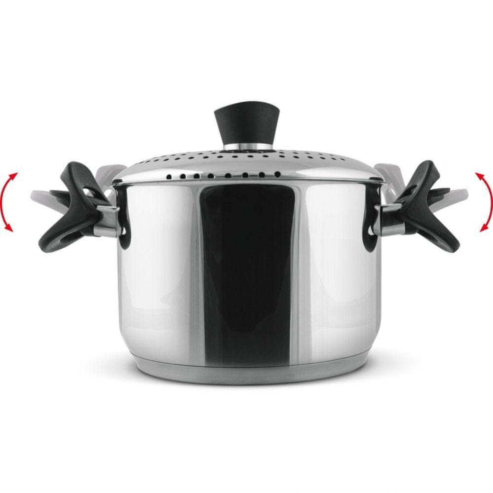 Pokrov iz nerjavnega jekla z mehanizmom za cedenje s posebnim lovilcem s preklopnimi ročaji za udobno cedenje testenin.