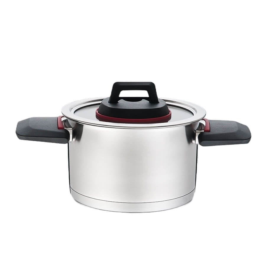 Zložljivi ročaji iz plastike v črni in rdeči barvi omogočajo udobno in varno uporabo, še posebej pri segrevanju na različnih kuhalnih ploščah, vključno z plinom, halogenom, elektriko, indukcijo, keramiko ter zatesnjenimi ploščami. To pomeni, da je posoda vsestranska in primerna za vse vrste kuhanja.