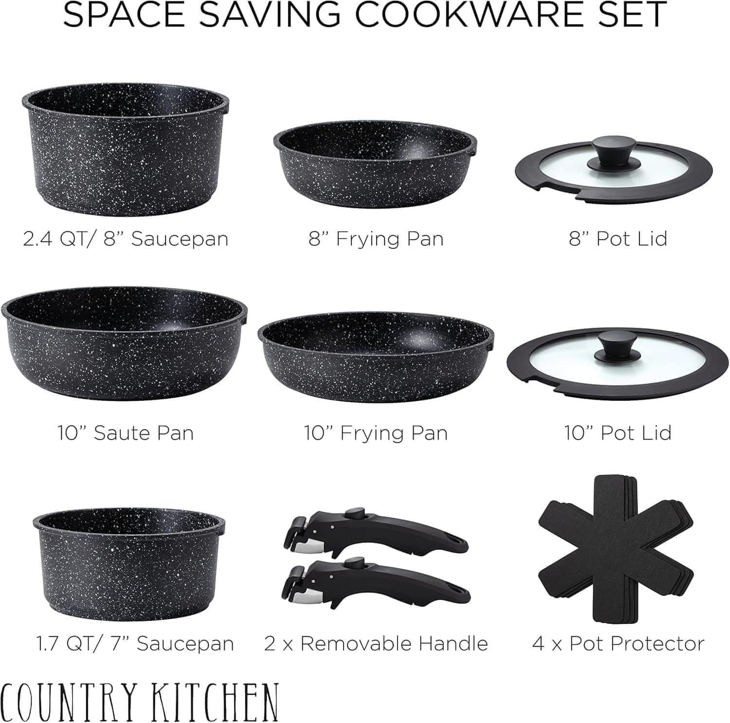 Netscroll 13-delni komplet loncev, set kuhinjskih loncev primeren za indukcijo, plin in pečico, prevleka proti prijemanju, odstranljivi ročaji, enakomerna toplota, brez PFAS/PFOA/svinca/kadmija, PanSet, črna