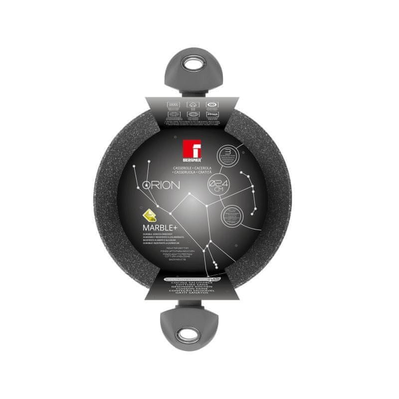 Kaseta brez pokrova, 24×10,5 cm. -Material: kovani aluminij. -Lonec, ki se ne prijema: ima marmorirano površino, ki se ne prijema. -Primeren za vse vrste štedilnikov, vključno z indukcijskimi. – Ergonomski ročaji z mehko površino in teksturo kačje kože. – Siva barva z belimi pikami. – Ne vsebuje PFOA: Posoda brez pokrova iz kolekcije Orion proizvajalca Bergner. Zaradi svoje velikosti, premera 24 cm in višine 10,5 cm, ter prostornine 4,0 l je idealna za pripravo vseh vrst posameznih receptov ali za dve osebi, družino in prijatelje pa bo presenetila z najrazličnejšimi jedmi. Lonec je izdelan iz kovanega aluminija, kakovostnega in trpežnega materiala, ki omogoča hitro in enakomerno porazdelitev toplote, preprečuje vroče točke in tako prihrani veliko energije. Poleg tega ta material daje kosu zelo dobre lastnosti, kot so lahkotnost, ohranjanje toplote pri visokih temperaturah ter odpornost na nevarnosti korozije, udarcev in prask. Lonec ima notranjo neprijemljivo plast Marble+, ki zagotavlja enakomernejši učinek sproščanja hrane, preprečuje, da bi se hrana prijela na površino, in olajša čiščenje. Ta prevleka je tudi izjemno trpežna in odporna proti praskam. Lonec ima točkovno indukcijsko dno, zaradi česar je primeren za vse vrste štedilnikov: keramične, električne, halogenske, plinske in indukcijske. Oblika lonca v sivi barvi z belimi pikami se odlično prilega vsaki vrsti kuhinje. Poleg tega ima dva ergonomska ročaja s teksturo kačje kože in mehkim zaključkom na dotik, ki bosta povzdignila raven vašega kuhanja in vas hkrati zaščitila pred opeklinami pri rokovanju s kosom. Zaradi vseh teh lastnosti je idealna za vse kuharje, od začetnikov do najbolj izkušenih. Za podaljšanje življenjske dobe izdelka je priporočljivo ročno pranje.