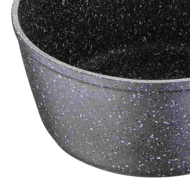 16×7,5 cm ponev brez pokrova. -Prostornina: 1,6 l. -Material: kovani aluminij. -Posoda, ki se ne prijema: ima marmorirano površino, ki se ne prijema. -Primerna za vse vrste štedilnikov, vključno z indukcijskimi. – Ergonomski ročaj z mehko površino in teksturo kačje kože. – Siva barva z belimi pikami. – Ne vsebuje PFOA: Ponev brez pokrova spada v kolekcijo Orion proizvajalca Bergner. Zaradi svoje velikosti, premera 16 cm in višine 7,5 cm, ter prostornine 1,6 litra je idealna za pripravo vseh vrst posameznih receptov ali za dve osebi in bo vašo družino in prijatelje presenetila s široko paleto jedi. Lonec je izdelan iz kovanega aluminija, visokokakovostnega in trpežnega materiala, ki omogoča hitro in enakomerno porazdelitev toplote, preprečuje vroče točke in tako prihrani veliko energije. Poleg tega ta material daje kosu zelo dobre lastnosti, kot so lahkost, ohranjanje toplote pri visokih temperaturah ter odpornost na nevarnosti korozije, udarcev in prask. Lonec ima notranjo neprijemljivo plast Marble+, ki zagotavlja enakomernejši učinek sproščanja hrane, preprečuje, da bi se hrana prijela na površino, in olajša čiščenje. Ta prevleka je tudi izjemno trpežna in odporna proti praskam. Lonec ima točkovno indukcijsko dno, zaradi česar je primeren za vse vrste štedilnikov: keramične, električne, halogenske, plinske in indukcijske. Oblika lonca v sivi barvi z belimi pikami se odlično prilega vsaki vrsti kuhinje. Poleg tega ima ergonomski ročaj s teksturo kačje kože in mehkim zaključkom na dotik, ki bo povzdignil raven vašega kuhanja in vas hkrati zaščitil pred opeklinami pri rokovanju s kosom. Zaradi vseh teh lastnosti je idealna za vse kuharje, od začetnikov do najbolj izkušenih. Za podaljšanje življenjske dobe izdelka je priporočljivo ročno pranje.