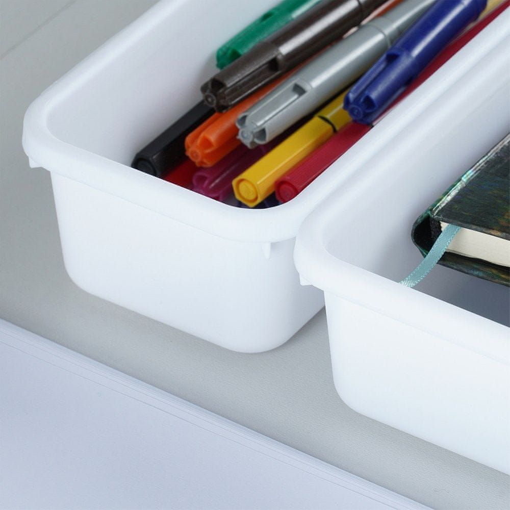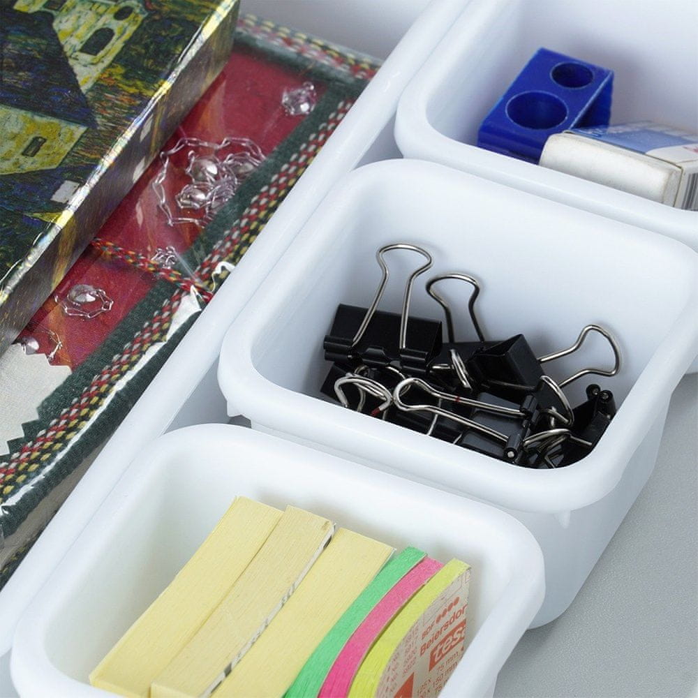 Komplet osmih organizatorjev s predali. Popolni za shranjevanje pisarniških pripomočkov. Komplet vsebuje: 2× veliki posodi (23,5 × 16 × 4,5 cm), 3× srednje velike posode (23,5 × 7,5 × 4,5 cm), 3× majhne posode (7,5 × 7,5 × 4,5 cm). Odlične so tudi za shranjevanje manjših kosov garderobe, nakita ali kozmetike. Zahvaljujoč modularni različici organizatorja lahko posode postavite kamor koli. Originalni izdelek Vilde. Izdelano v skladu z evropskimi standardi.