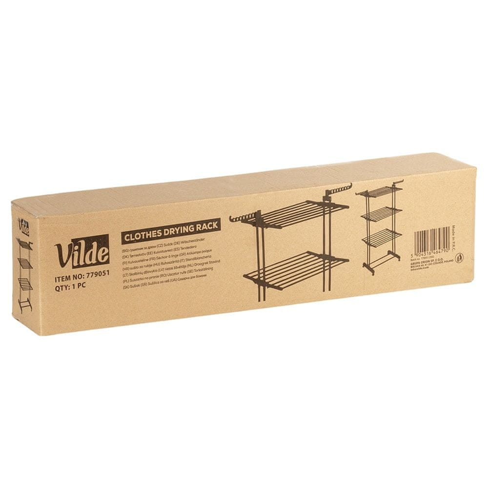 Navpični tristopenjski sušilni stroj za perilo. Izdelan je iz trpežnih materialov in je v modni črni barvi ter ima šest zložljivih ročic, zaradi česar je idealen za obešanje majhnih in velikih količin perila. Dodatni kavlji za obešanje in polica olajšajo organizacijo oblačil in obutve med sušenjem. Zahvaljujoč funkciji zlaganja sušilni stroj v zloženem stanju ne zavzame veliko prostora. Nepogrešljiv kos opreme v vsakem domu. Ob pravilni uporabi bo zdržal leta. Originalni izdelek Vilde. Izdelano v skladu z evropskimi standardi.