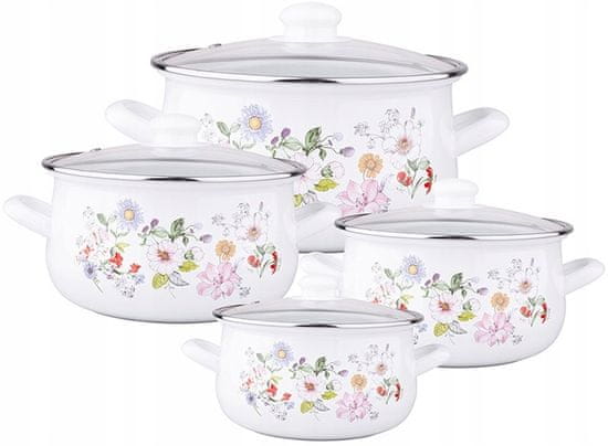 Emajlirani lonci s pokrovi, 8-delni komplet. Ta komplet emajliranih loncev s pokrovi je primeren tako za plinske kot za indukcijske kuhalne plošče. Stekleni pokrovi so priloženi. Čudovit, klasičen cvetlični vzorec se poda k vsaki vrsti kuhalne plošče. Komplet vsebuje 4 lonce s štirimi pokrovi: 1× lonec s pokrovom premera 16 cm, prostornina 1,8 l, 1× lonec s pokrovom premera 18 cm, prostornina 2,4 l, 1× lonec s pokrovom premera 20 cm, prostornina 3,3 l, 1× lonec s pokrovom premera 22 cm, prostornina 4,8 l. Parametri: Znamka: Silesia Material: emajl Dimenzije lonca: 1,8 l, 2,4 l, 3,3 l, 4,8 l Indukcija: Da Uporaba: Kuhinja