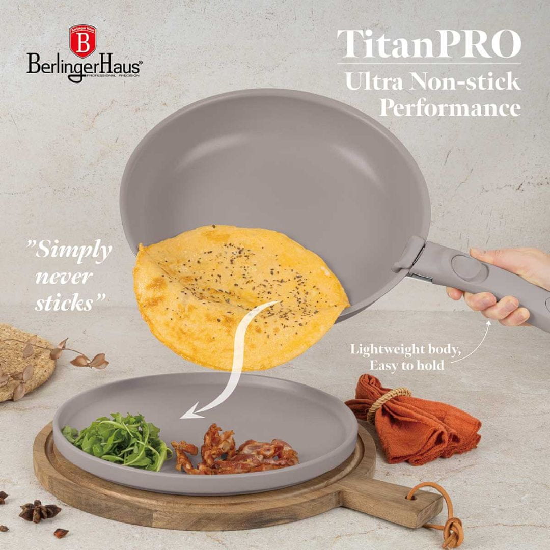Vrhunski komplet aluminijastih loncev in ponv s trojno prevleko iz titana TYTAN PRO in snemljivim ročajem s sistemom Click it. Izdelek priznane blagovne znamke BERLINGER HAUS iz kolekcije Taupe. Primeren za vse vrste štedilnikov, vključno z indukcijo. Ponve in lonci imajo udobne, snemljive ročaje, ki ostanejo hladni. Zaradi tega jih je enostavno shraniti, jih je mogoče prati v pečici in pomivati v pomivalnem stroju. Lonci imajo natančno brušeno, ravno dno s feromagnetno ploščo. To zagotavlja enakomerno segrevanje hrane in zelo dobro zadrževanje toplote. Sistem snemljivih ročajev olajša shranjevanje loncev. Plastični pokrovi, ki so priloženi kompletu, vam omogočajo, da posode tesno pokrijete, ko želite hrano shraniti v hladilniku.