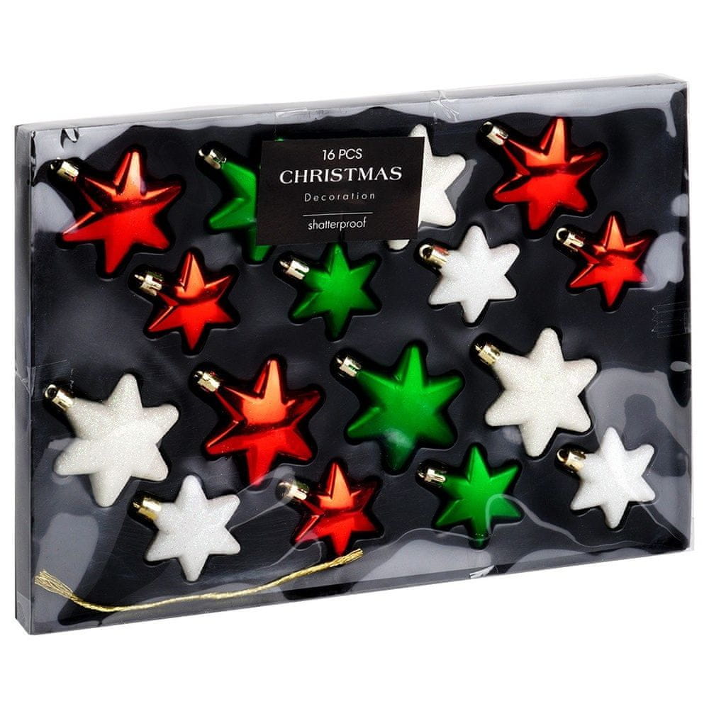 Komplet 16 nelomljivih kroglic. Vsebuje: 8× zvezdic s premerom 6 cm (2× zelene, 2× rdeče, 2× bele bleščice), 8 x zvezdic s premerom 5 cm (2× zelene, 2× rdeče, 2× bele bleščice). Te kroglice izgledajo zelo impresivno. Nepogrešljive za okraševanje božičnih drevesc, božičnih aranžmajev in vencev. Na božičnem drevescu bodo ustvarile edinstven okras. Z njihovo pomočjo lahko svoje božično drevo okrasite v modnem slogu. Izdelane v skladu z evropskimi standardi.