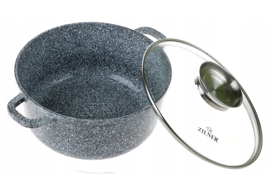 SET LONČKOV Z MARMORNIM PREVLEKOM 12 elementov Set uporabnih brezplačnih izdelkov Set ZILNER ZL-7082 je luksuzen set marmornih loncev, ki je nastal z združevanjem visokokakovostnega materiala z modernim dizajnom in upoštevanjem funkcionalnosti. Stekleni pokrovi, ki se popolnoma ujemajo s posameznimi lončki, so opremljeni z inovativnimi ročaji Aroma Knob – dozirnikom, ki omogoča enostavno in priročno uporabo. dodajanje olja ali tekočih začimb med pripravo jedi. Omogoča vam pripravo okusnih jedi in se popolnoma prilega notranjosti vsake kuhinje – vaši kuhinji bo dal moderen stil in presenetil vaše goste! Celoten komplet loncev vam omogoča hitro kuhanje in segrevanje hrane ter dolgotrajno vzdrževanje visoke temperature v notranjosti. KOMPLET PRAKTIČNIH BREZPLAČNIH DARIL: Silikonski strgalnik, Jeklen strgalnik s praktičnim ročajem, KVALITETNA IZDELAVA. IZDELEK, KI BO DOLGO ČASA Set iz visokokakovostnega nerjavečega jekla Tesni pokrovi z odprtino za paro iz močnega toplotno odpornega stekla, Debelo, 5-slojno, indukcijsko dno, odlično prevaja toploto, Ne segrevajo se, zakovičeni ročaji, Posode lahko uporabljate na vseh vrstah indukcijskih, plinskih, keramičnih, steklenih, halogenskih in električnih štedilnikov, Zahvaljujoč uporabljenemu materialu lonci so enostavni za čiščenje, oblika robov preprečuje kapljanje med kuhanjem, lonci imajo v notranjosti plast, ki preprečuje prijemanje kuhane hrane, primerni za pomivanje v pomivalnem stroju, lonci so zelo enostavni za čiščenje, pokrovi iz toplotno odpornega kaljenega stekla z zračnikom, primerni za pomivanje v pomivalnem stroju, brez škodljivih snovi PFOA (perfluorooktanojska kislina – škodljiva snov, ki se uporablja pri izdelavi teflonskih ponv) Set omogoča udobno kuhanje, dušenje in pečenje jedi. Luksuzna oblika posode v kompletu se popolnoma prilega vsakemu kuhinjskemu interierju, mu daje izviren značaj in omogoča neverjetno priročno, varno in zdravo pripravo vsakodnevnih obrokov. VSEBINA SETA: Lonec s pokrovom prostornine ~2,3L, 20 cm x 9,5 cm Lonec s pokrovom prostornine ~4,5L, 24 cm x 11,5 cm Lonec s pokrovom prostornine ~6,8L, 28 cm x 12,5 cm Ponev s pokrovom prostornine ~1,3L, 16 cm x 8 cm Ponev 24 cm x 4,5 cm Ponev 28 cm x 7,0 cm Bakelitno stojalo za vroče posode x2 Silikonski strgalnik – naključna barva BREZPLAČNO Žična goba – naključna barva ročaja BREZPLAČNO