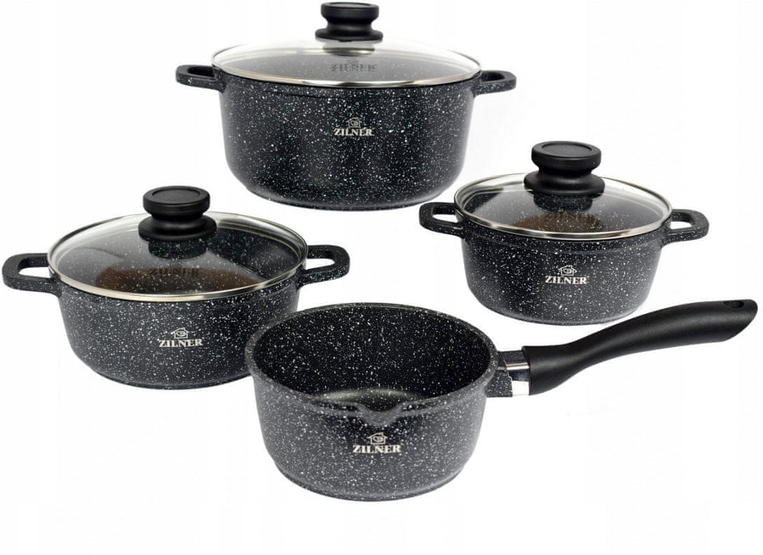 SET LONČKOV Z MARMORJEM 7 elementov Set uporabnih brezplačnih izdelkov Set ZILNER je luksuzen set marmornih loncev, ki je nastal s kombinacijo visokokakovostnega materiala z modernim dizajnom in upoštevanjem funkcionalnosti. Omogoča vam pripravo okusnih jedi in se popolnoma prilega notranjosti vsake kuhinje – vaši kuhinji bo dal moderen stil in presenetil vaše goste! KOMPLET PRAKTIČNIH BREZPLAČNIH DARIL: Silikonski strgalnik, Jeklen strgalnik s praktičnim ročajem, KVALITETNA IZDELAVA. IZDELEK, KI BO DOLGO SLUŽIL Visokokakovosten komplet aluminijastih posod, prekritih z marmorno-keramično plastjo proti sprijemanju Uporaben na vseh vrstah štedilnikov: indukcijskih, električnih, plinskih, keramičnih in halogenskih Odporen na obrabo in visoke temperature Lahko se uporablja v pečici! Lončki so zelo enostavni za čiščenje. Pokrovi iz toplotno odpornega kaljenega stekla z zračnikom. Pralno v pomivalnem stroju. Brez škodljivih snovi PFOA (perfluorooktanojska kislina – škodljiva snov, ki se uporablja pri proizvodnji teflonskih ponv). Set ZILNER ZL-97016 omogoča udobno kuhanje, dušenje in pečenje jedi. Luksuzna oblika posode v kompletu se popolnoma prilega vsakemu kuhinjskemu interierju, mu daje izviren značaj in omogoča neverjetno priročno, varno in zdravo pripravo vsakodnevnih obrokov. VSEBINA SETA: Lonec s pokrovom Ø16 × 8cm 1,3L Lonec s pokrovom Ø20 × 10cm 2,3L Lonec s pokrovom Ø24 × 12cm 4,5L Ponev Ø16 × 8cm 1,3L Silikonski lonec – naključna barva Jeklena lonec – naključna barva ročaja