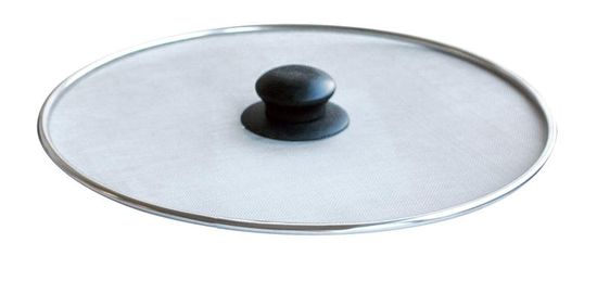Zaščitni mrežast pokrov ponve je izdelan iz finega kovinskega tkiva z mrežo 0,7 × 0,7 mm in učinkovito preprečuje brizganje maščobe iz ponve med cvrtjem hrane. Tkanina je trdno povezana z jeklenim obročem in plastičnim ročajem. Premer 29 cm