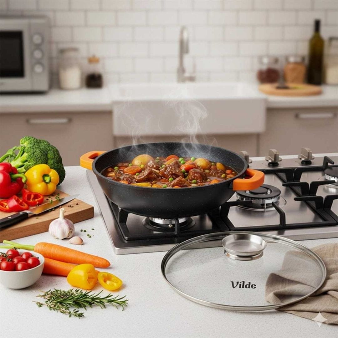 Ta globoka ponev z razpršilnim pokrovom in silikonskimi ročaji je funkcionalna posoda za cvrtje, dušenje, peko in pripravo krepkih, aromatičnih jedi. Je trdna, udobna za uporabo in popoln dodatek k vsaki kuhinji. Originalni izdelek Vilde iz linije Terruna Aroma. Izdelano v skladu z evropskimi standardi.
