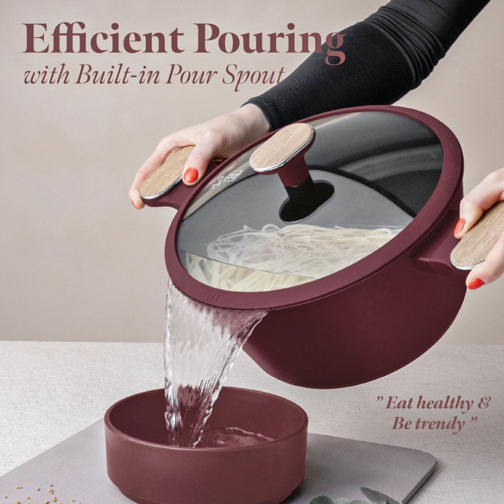 Vstopite v svet profesionalnega kuhanja s tem ekskluzivnim setom posode, ki združuje lahkost kovanega aluminija in vrhunsko nelepljivo površino TitanPro. Vsak kos je zasnovan tako, da olajša pripravo hrane, hkrati pa v vašo kuhinjo vnese slog in funkcionalnost v minimalističnem dizajnu z matirano bordo barvo in lesenimi detajli.