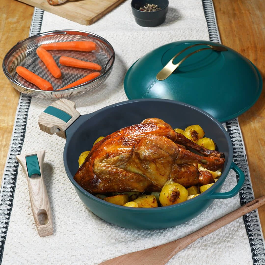 Odkrijte Cookut Fabuleuse 8-v-1, edinstveno in inovativno ponev, ki bo popolnoma spremenila vaš način kuhanja! S premerom 28 cm (kapaciteta 4,5 litra) je primerna za pripravo obrokov za 1 do 8 oseb. Idealna je tako za vsakodnevno uporabo kot tudi za posebne priložnosti. Zasnovana je tako, da nadomešča kar osem različnih kuhinjskih pripomočkov: ponev, ponev za cvrtje, ponev za praženje, kozico za enolončnico, soparnik, cvrtnik, pekač in tortni pekač. S to ponvijo lahko preprosto pripravite raznolike jedi – od ocvrtih jajc, gratiniranega krompirja, pečenega piščanca, juh, dušene zelenjave do tort in pic. Ne glede na to, ali kuhate za eno ali več oseb, vam Fabuleuse omogoča enostavno in učinkovito pripravo okusnih obrokov. Izdelana je iz 100% reciklirane kovine – aluminija (brez PFOA in niklja). Vrhunski premaz proti prijemanju omogoča kuhanje brez oz. z malo dodajanja maščobe, hkrati pa zagotavlja dolgo življenjsko dobo. Ponev se ponaša z dolgim in kratkim odstranljivim ročajem za enostavno uporabo in shranjevanje. Zahvaljujoč snemljivim ročajem jo zlahka shranite tudi v manjših kuhinjah. Ročaj na pokrovu ostane hladen tudi med kuhanjem. Priložena košara za kuhanje na pari ali cvrtje ter lesena lopatka nudita še več možnosti kuhanja. Fabuleuse je primerna za vse vrste kuhalnih površin – indukcijska, plinska, električna in steklokeramična. Ob odstranitvi ročajev jo lahko uporabite tudi v pečici do 240°C, zato je popolna kot pekač. Primerna je za pomivanje v pomivalnem stroju. Preizkusite jo in odkrijte nov način kuhanja s samo enim pripomočkom! Dimenzije: dolžina z ročajem 24 cm, višina brez pokrova 8,5 cm, višina s pokrovom 17 cm / Premer košare: 25 cm