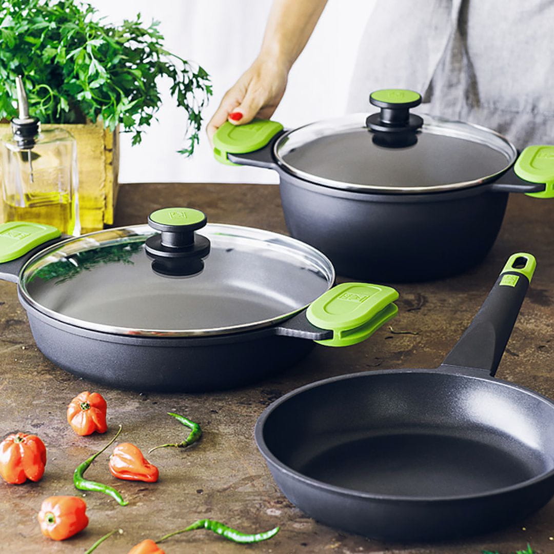 PRIOR VISOKA KOZICA s premerom 32 cm je odlična za vsakodnevno kuhanje, ki poleg dobre cene združuje tudi kakovost in sodoben dizajn. Lit aluminij je prevlečen s premazom proti sprijemanju hrane – Teflon Classic, ki ne vsebuje PFOA. Kozica je odporna tudi proti deformacijam, saj debelina dna meri kar 5,5 mm. Lahko jo uporabite na vseh kuhalnih površinah, saj zagotavlja odlično porazdelitev temperature. Opremljena je še s steklenim pokrovom z robustnim ročajem in dvema zelenima silikonskima prijemalkama, ki omogočata enostavno rokovanje. Kozico Prior lahko postavite tudi v pečico do 220 °C, BREZ silikonskih ročajev. Lahko jo pomijete tudi v pomivalnem stroju, a vam za ohranitev njenih funkcionalnosti priporočamo ročno pomivanje.
