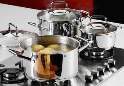 Komplet loncev Trend odlikuje elegantna oblika, kakovost in dolga življenjska doba. Ročaji so na posodi varjeni na štirih točkah, kar omogoča boljši prijem in stabilnost. WMF lonci so primerni za vse vrste kuhalnih površin, vključno z indukcijo. WMF lonci so nerjaveči in zagotavljajo nevtralen okus ter os obstojni na toploto do 250°C. Vsa posoda je izdelana iz poliranega nerjavečega jekla, ki se ga lahko umiva v pomivalnem stroju.