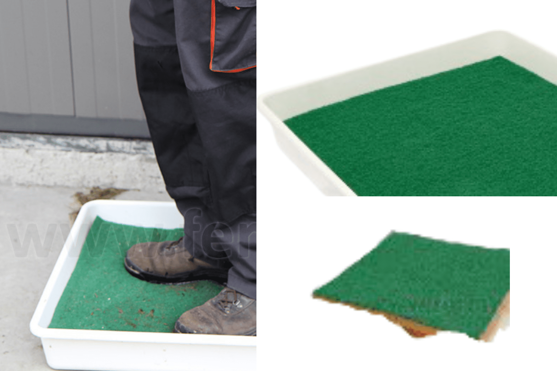 Praktična dezinfekcijska posoda za razkuževanje prometa za pešce, postavljena pred vhodom v živinorejo, kokošnjaki, hlevi. V notranjosti plastične posode je preproga ki jo namočimo z razkužilom. V tej obliki se preproga uporablja za razkuževanje čevljev ljudi, ki vstopajo v živinorejski objekt. Celoten opis