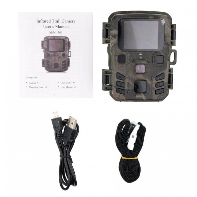 Mini fotografska past Secutek SST-MiNi301 je opremljena s kamero z 60° zornim kotom, možnostjo fotografiranja do ločljivosti 12 MP in snemanja videa do ločljivosti Full HD Za uporabo ponoči ima foto past vgrajeni 2 infrardeči LED diodi, ki osvetljujeta nočni prizor na razdalji do 20 metrov Naprava ima tudi senzor PIR z nastavljivo občutljivostjo v treh stopnjah, ki ga foto past aktivira, če zazna gibanje v svoji okolici.