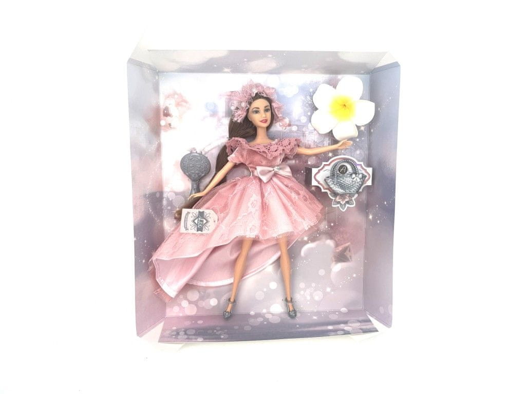Letka ima realističen obraz z nežno naslikanimi značilnostmi, dolge temne lase in nosi srebrne čevlje, ki dopolnjujejo celotno obleko. V paketu je tudi nekaj dodatkov, ki razširjajo možnosti igre – majhna srebrna krtača za lase in drugi drobni elementi, ki spodbujajo otroško ustvarjalnost pri igri. Celoten komplet je zapakiran v dekorativno prozorno škatlo s cvetličnimi motivi in nežnim pastelnim ozadjem, kar poveča njegovo privlačnost kot darila.