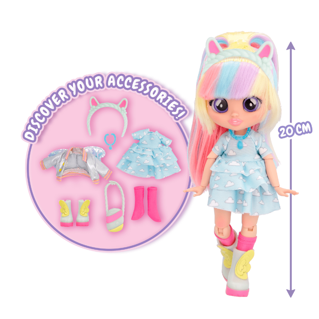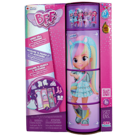 „Cry Babies BFF je zbirateljska modna lutka, s katero se lahko izraziš, igraš z modo in se poistovetiš s svojim najljubšim likom iz animirane serije Cry Babies Magic Tears. Lutka je visoka 20 cm, ima 15 cm dolge svilnate najlonske lase in veliko modnih dodatkov. Telo lutke ima 6 gibljivih sklepov za nameščanje. Paket je premičen, ima vrtljive valje, zato si lahko ogledate, kako lutka zavzame različne poze. V paketu je lutka in tudi 9 dodatkov: 2 kosa oblačil, torbica, klobuk, par ujemajočih se čevljev s parom nogavic in ogrlica!“