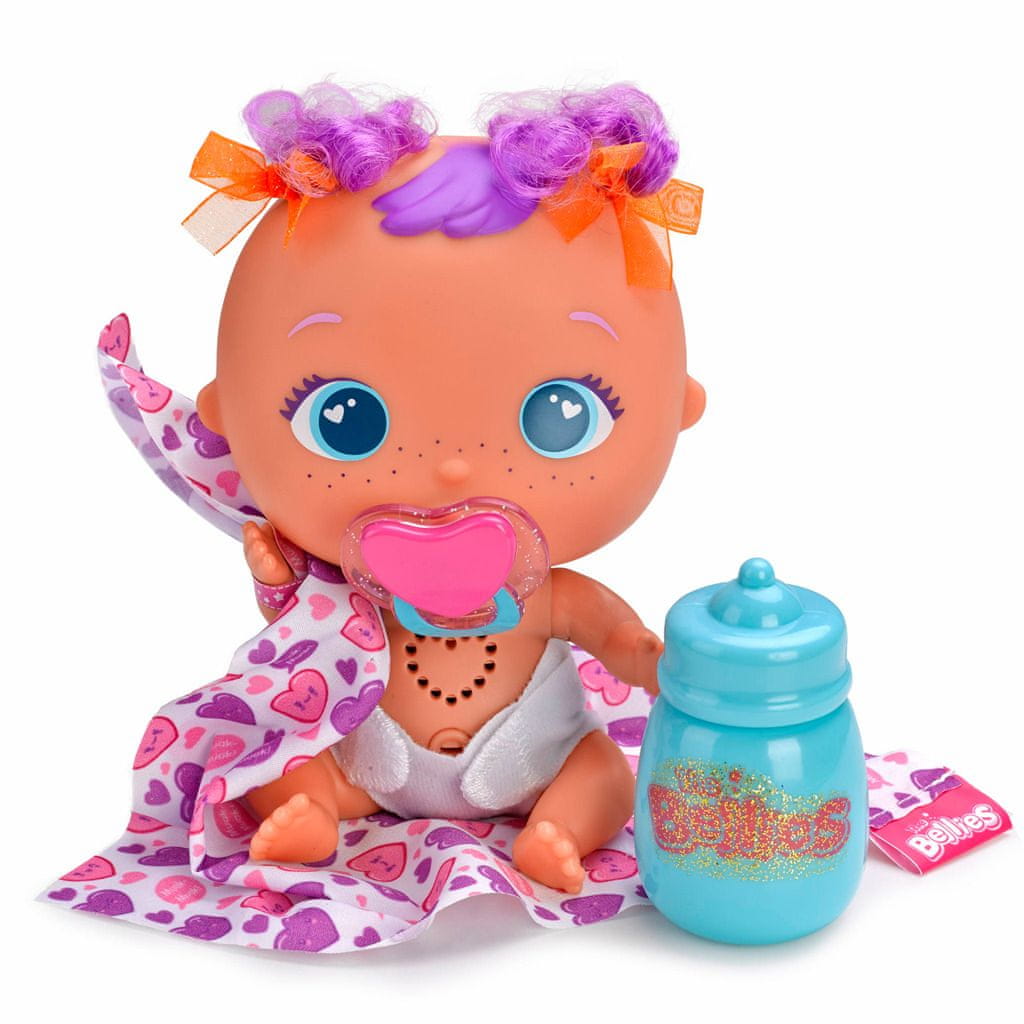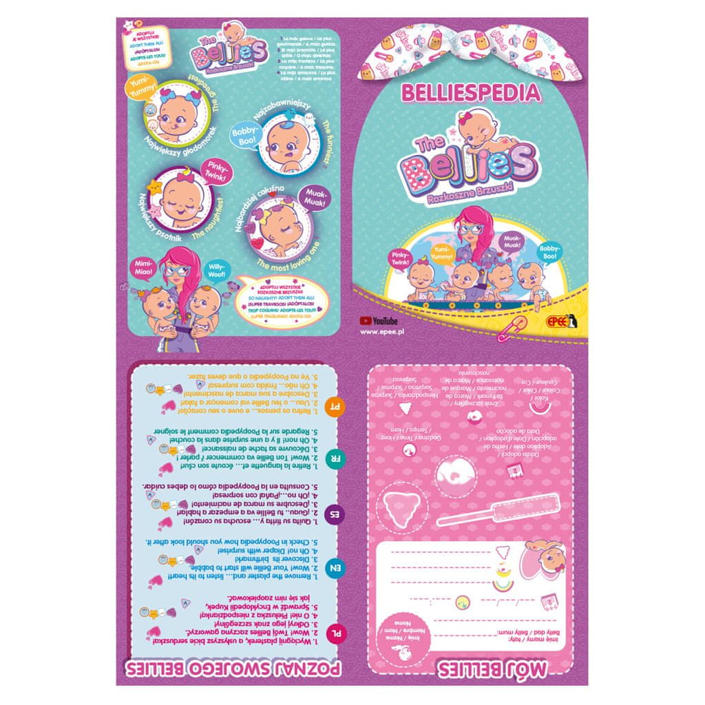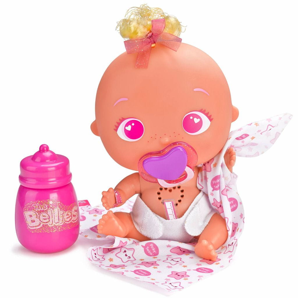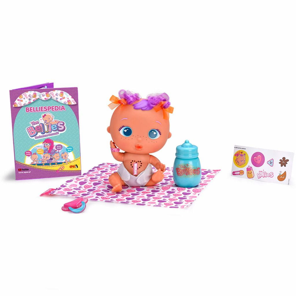 Simpatični dojenčki Bellies iščejo nov dom. Interaktivni dojenčki žvrgolijo in njihova srca bijejo. Vsak ima edinstveno materino znamenje. Vključeno je veliko dodatkov, ki vam bodo pomagali pri negi dojenčka. Prilagodite enega ali morda vse! Vsebina paketa: lutka, otroška steklenička, dude, potiskana odeja, komplet nalepk, potrdilo o posvojitvi. Sorta 4: Pinky-Twink, Yumi-Yummy, Muak-Muak, Bobby-Boo. Za otroke od 2. leta starosti.
