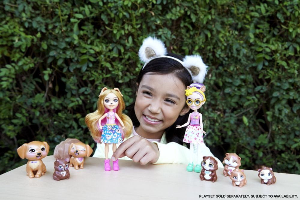Poznajte Enchantimals, skupino prikupnih bitij, ki imajo posebno vez s svojimi hišnimi ljubljenčki. Ti družinski kompleti Enchantimals vključujejo lutko (15 cm) in 3–4 hišne ljubljenčke. Majhni otroci se bodo z veseljem igrali na posebno vez, ki si jo delijo ti najboljši prijatelji. Figurice hišnih ljubljenčkov so vsak po svojem videzu edinstvene. Zberite vse in razširite svoj čarobni svet Enchantimals! Prodaja se posamično glede na trenutno zalogo. Vključuje lutko v modni obleki z dodatki in 3–4 figurice živali. Barve in videz izdelka se lahko razlikujejo.