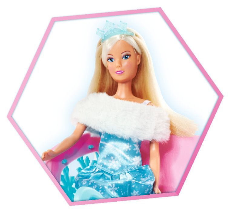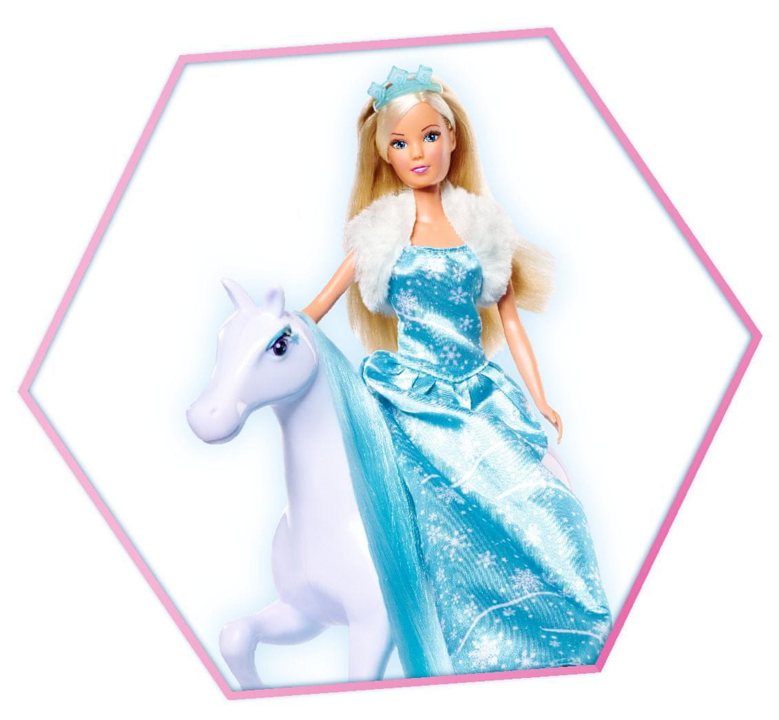 Lutka Steffi kot ledena princesa s konjem in čarobnimi zimskimi sanmi. Celoten opis