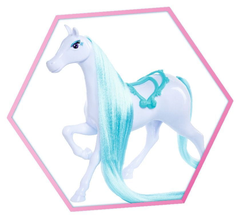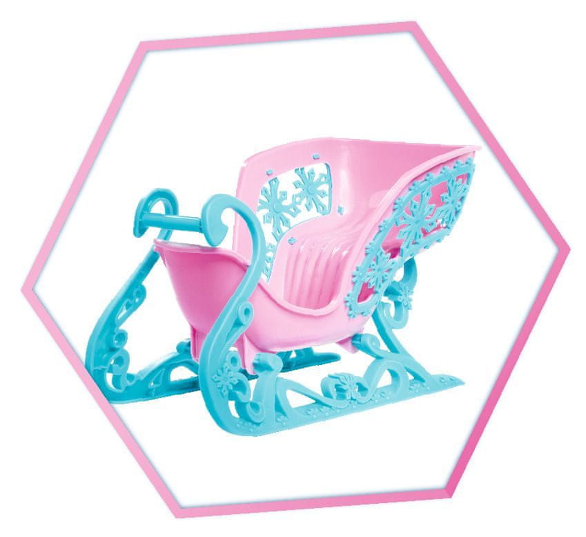 Lutka Steffi kot ledena princesa s konjem in čarobnimi zimskimi sanmi. Dolžina 60 cm. Velikost lutke 29 cm.