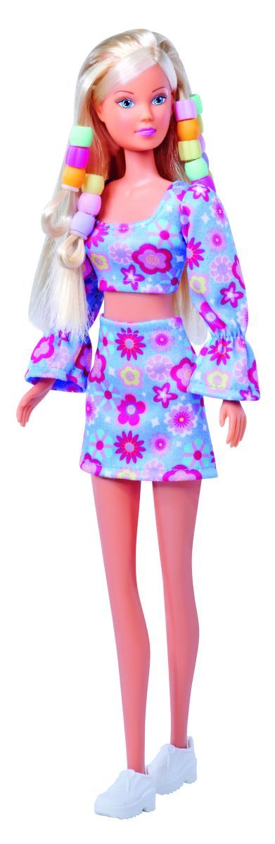 Plesalka Steffi v cvetlični dvodelni obleki, s kavljem za nanizanje kroglice na pramen las, barvnimi kroglicami, elastiko za pritrditev in glavnikom s prostorom za shranjevanje. Višina lutke 29 cm.