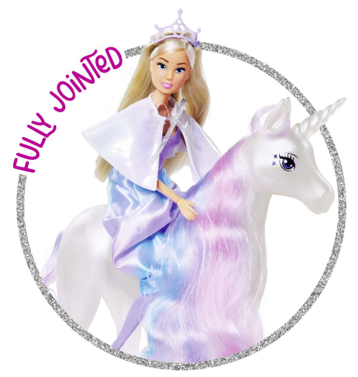 Mis Stefii v čarobni princesski obleki z enorožcem, ki se sveti in ima dolgo grivo za česanje. Višina lutke je 29 cm.