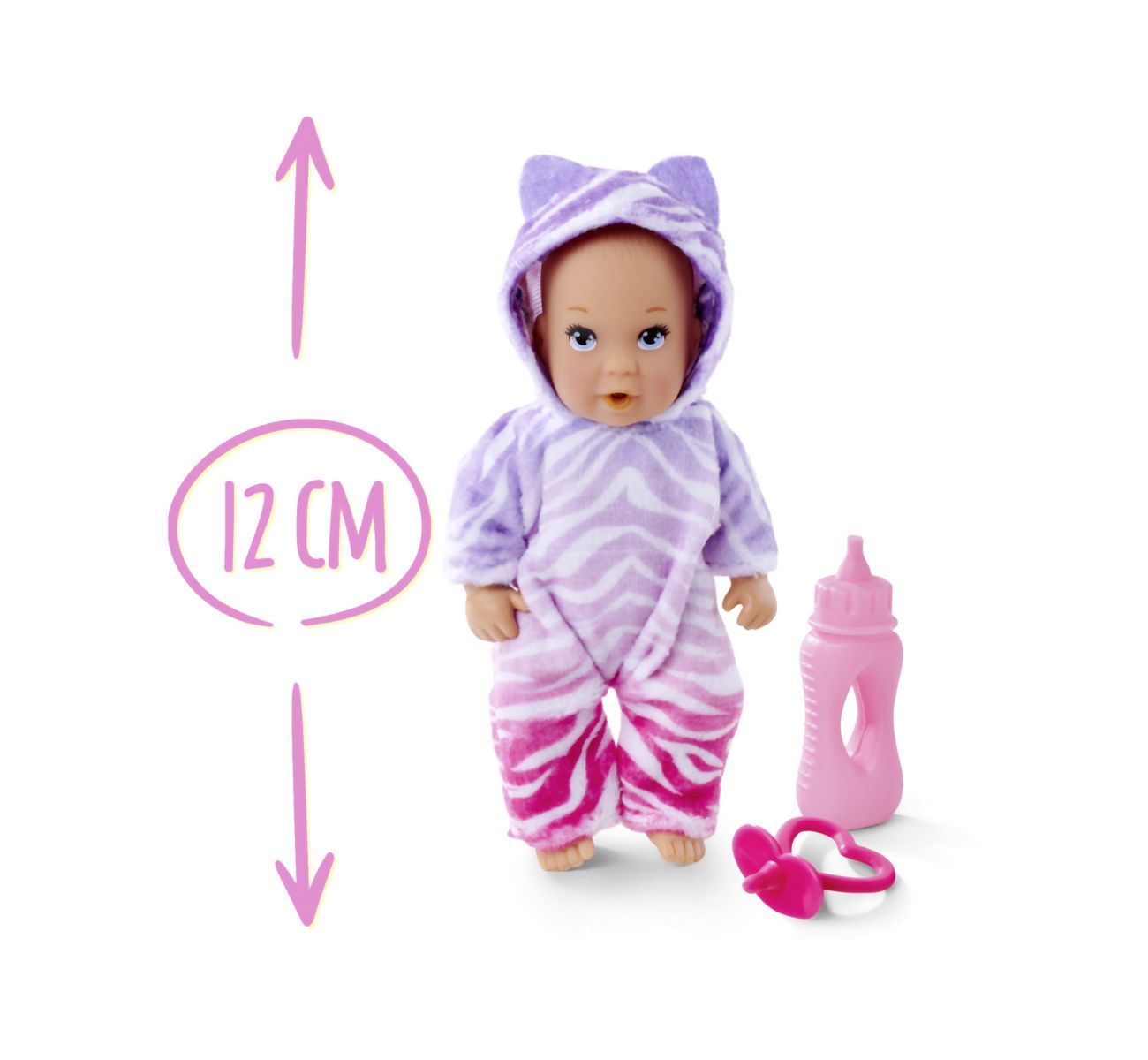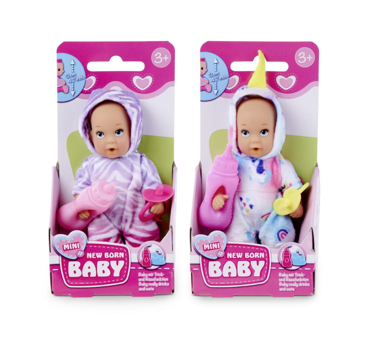 New Born Baby MINI lutka pije in urinira. Paket vključuje stekleničko in dudo. Pižama je na voljo v dveh motivih – enorožec in džungla. Višina lutke je 12 cm.