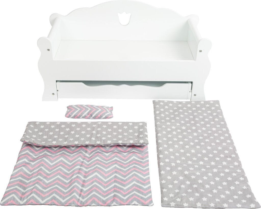 Posteljica za lutko z največjo višino 45 cm, obojestranska odeja, vzglavnik, prostor za shranjevanje, izdelana iz lesa, čudovit dizajn. Celoten opis