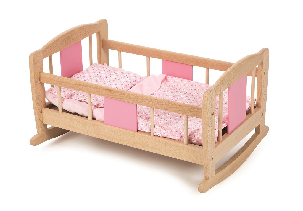 Svojo lutko uspavajte v slogu. Lesena zibelka ima zaobljene robove in vogale za večjo varnost, v njej pa najdete blazino in odejo z belo-rožnato cvetlično prevleko. Primerna za večino lutk standardne velikosti – do 50 cm. Odličen način za spodbujanje otrok k igranju vlog. Razvija občutek za druženje. Po razpakiranju je treba zložiti. Izdelano iz kakovostnih materialov iz odgovornih virov. V skladu z evropskimi varnostnimi standardi. Glavne značilnosti: varnost za lutke do 50 cm