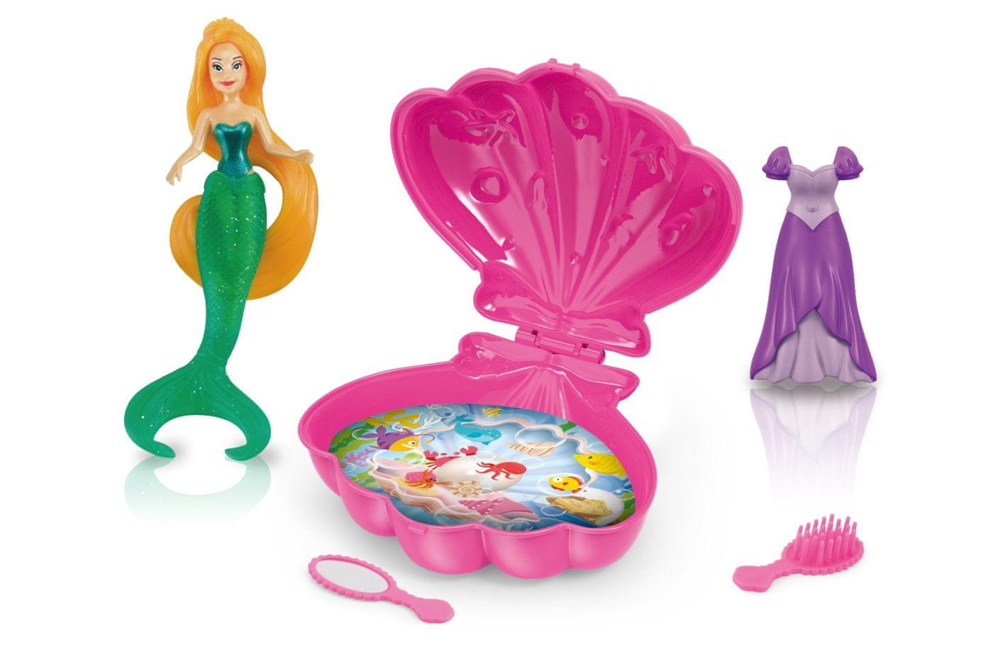 Morska vila s školjko. Velikost 9,5 cm. Vključuje vilo, školjko, obleko, ogledalo, glavnik. 3 barvne različice školjke – rumena, modra, vijolična.