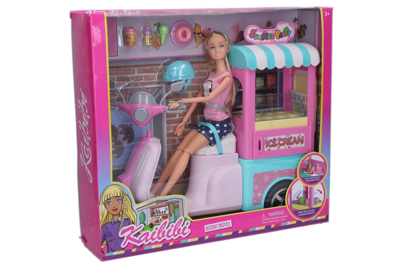 Sladolednica. Velikost 30 cm. Vključuje lutko, sladoledni skuter, čelado, dodatke.