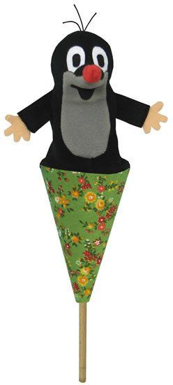 Srednja stožčasta lutka Krtka, tekstil, ki se upravlja z leseno palico.Ni primerno za otroke, mlajše od 3 let, nevarnost vboda Celoten opis