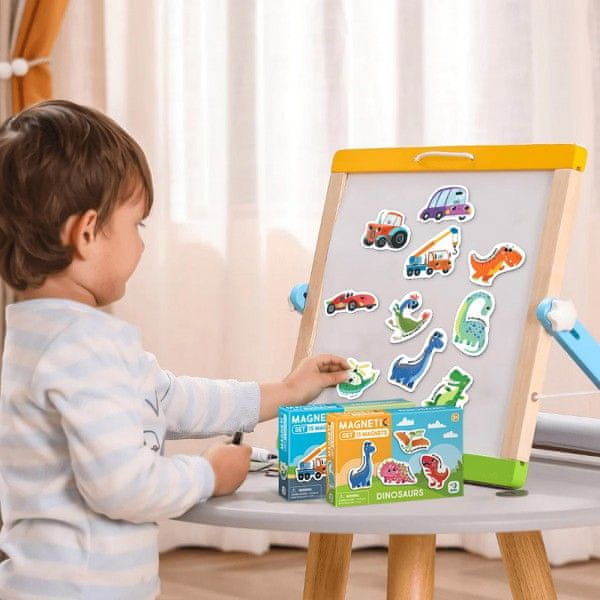 Set vsebuje 15 magnetov. Otroci lahko koščke preprosto pritrdijo na magnetno tablo ali hladilnik, razvijajo fino motoriko, domišljijo in se učijo prepoznavati živali. Igra je idealna za otroke od 3. leta starosti naprej ter spodbuja ustvarjalno igro in učenje.