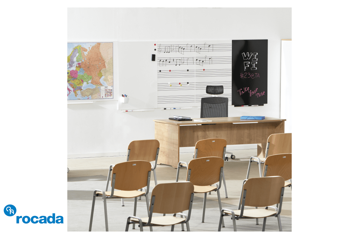 rocada NBT-6421MUS – SkinBoard bela magnetna tabla z odtisnjenim notnim črtovjem za glasbeni pouk španske blagovne znamke ROCADA je namenjena uporabi na steni ali s prislonitvijo kamorkoli, lahko pa jo kombinirate skupaj z drugimi tablami istega tipa (SkinBoard) za večjo dimenzijo pisalne površine.