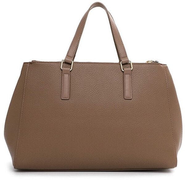 Velika rjava torbica z drobno površinsko strukturo. Dvojni ročaji za nošenje v roki in na podlakti. Celoten opis