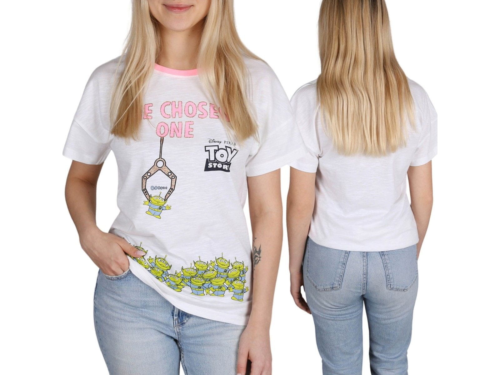 Bela ženska majica iz kolekcije Disney Pixar, ki jo je navdihnil kultni film „Toy Story“.Na sprednji strani je zabaven potisk z nezemljanom in napisom „The Chosen One“, ki se nanaša na prizor z zgražanjem.Zaključena je z rožnatim ovratnikom, ki dodaja subtilen pridih, kot nalašč za mlade oboževalce Celoten opis