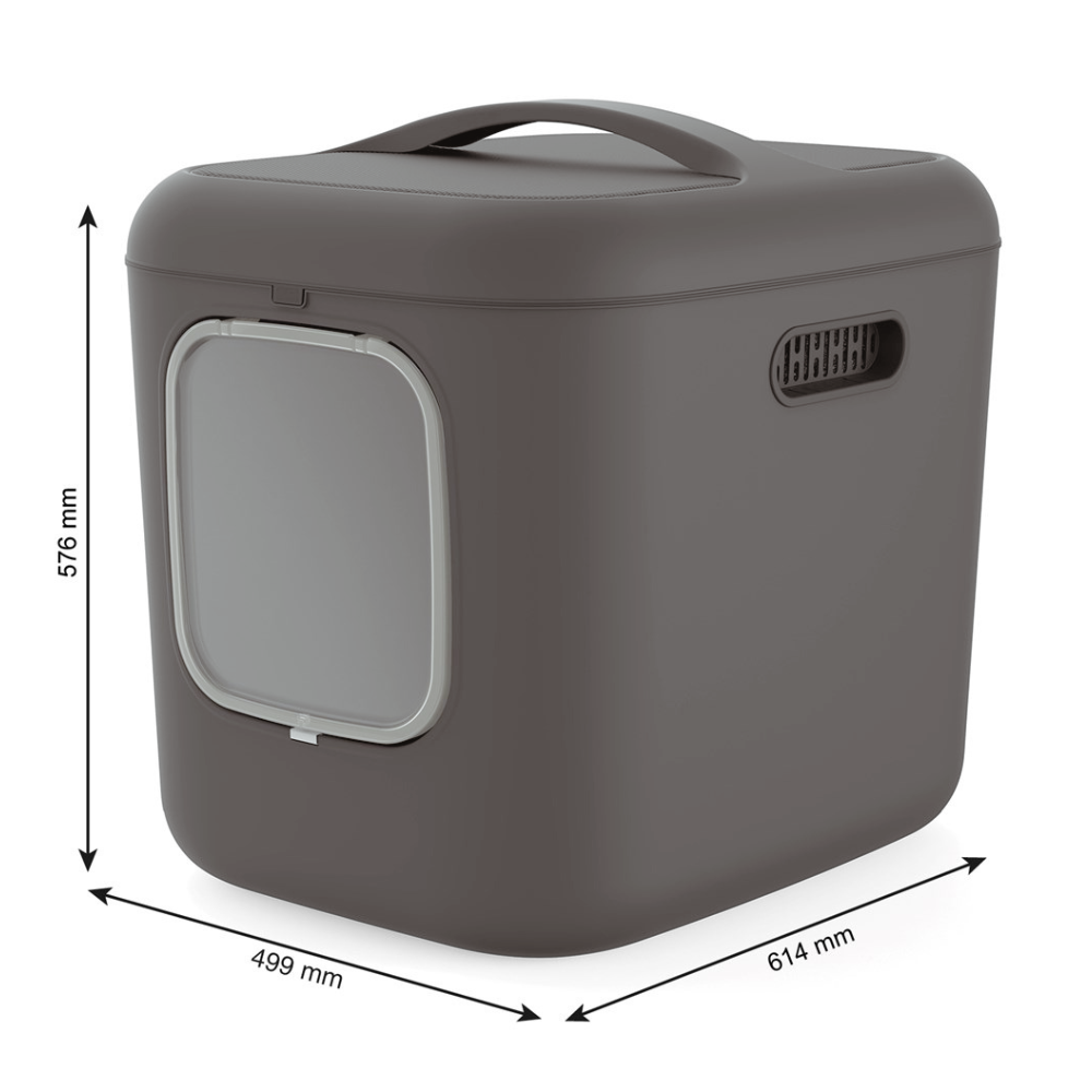 - Kompaktna zasnova – omogoča postavitev škatle tudi v majhne prostore, ne da bi pri tem ogrozili funkcionalnost. Kljub veliki zmogljivosti in prostorni zasnovi je škatla zasnovana tako, da v vašem domu zavzame minimalno prostora. Zahvaljujoč optimalni obliki jo lahko postavite v kot, pod umivalnik ali na drugo priročno mesto, ne da bi pri tem motili celotno estetiko prostora. Zaradi elegantne oblike in nevtralnih barv je mačje stranišče primerno za različne notranje sloge – od modernega do klasičnega. Je odlična rešitev za tiste, ki v svojem domu cenijo tako funkcionalnost kot dizajn.