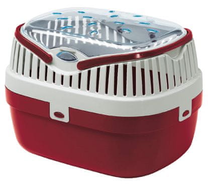 Transportna škatla iz poliestra za majhne pse in mačke. Dimenzije škatle: 38 × 25 × 25 cm. – s pritrdilnim trakom in distančno žico – s trakovi za nošenje – z integriranim kratkim povodcem – z odsevnimi elementi – z odstranljivim oblazinjenim dnom.