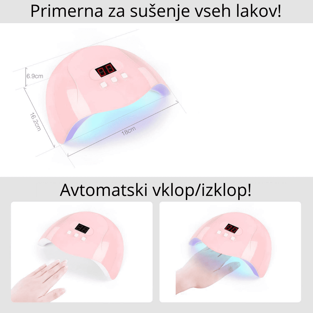18 UV/LED diod omogoča hitro sušenje UV in LED lakov. Lučka Ima vgrajen senzor, ki zazna roko v napravi in jo avtomatsko vklopi ali izklopi. Na nadzorni plošči ima prikazovalnik časa in 3 prednastavljene časovnike (30s/60s/90s). Celoten opis