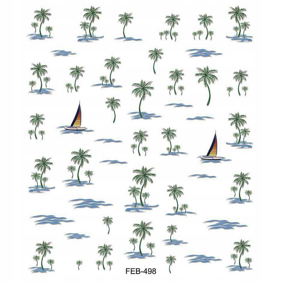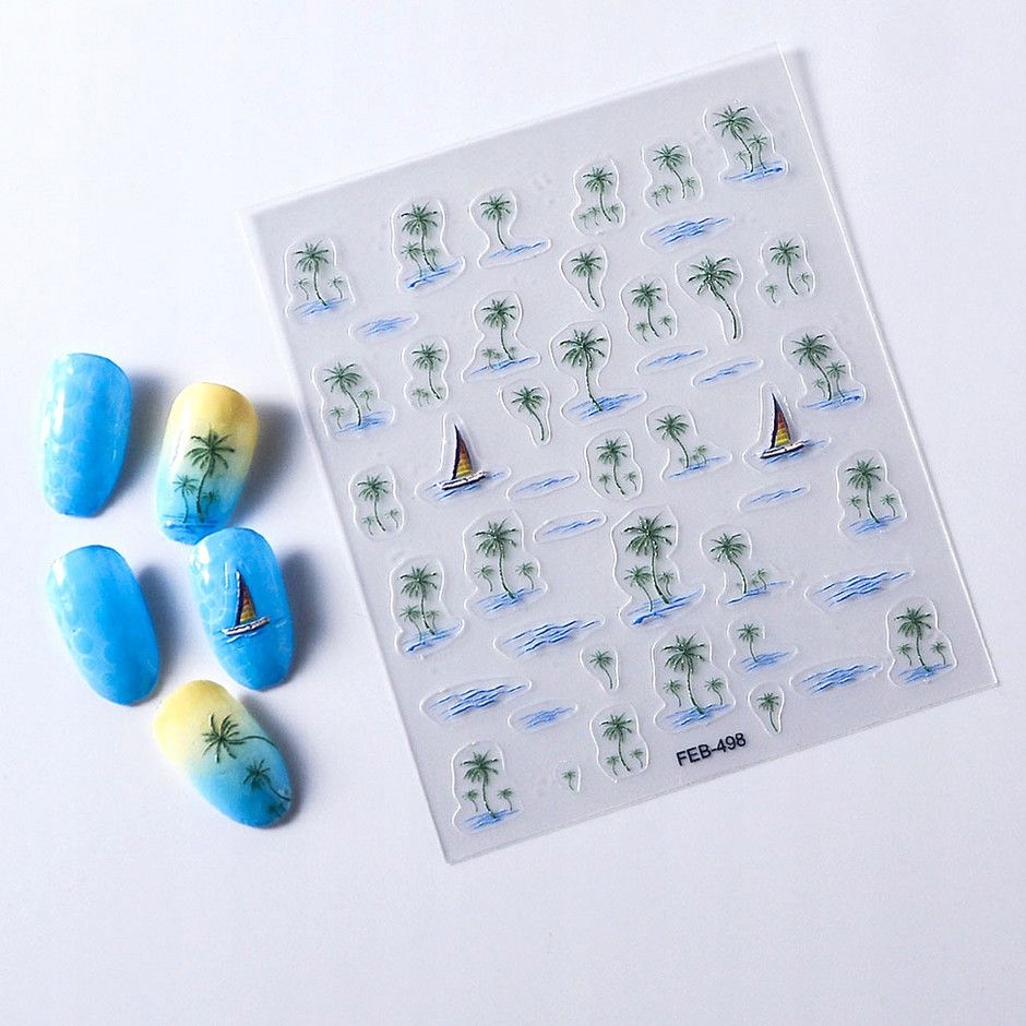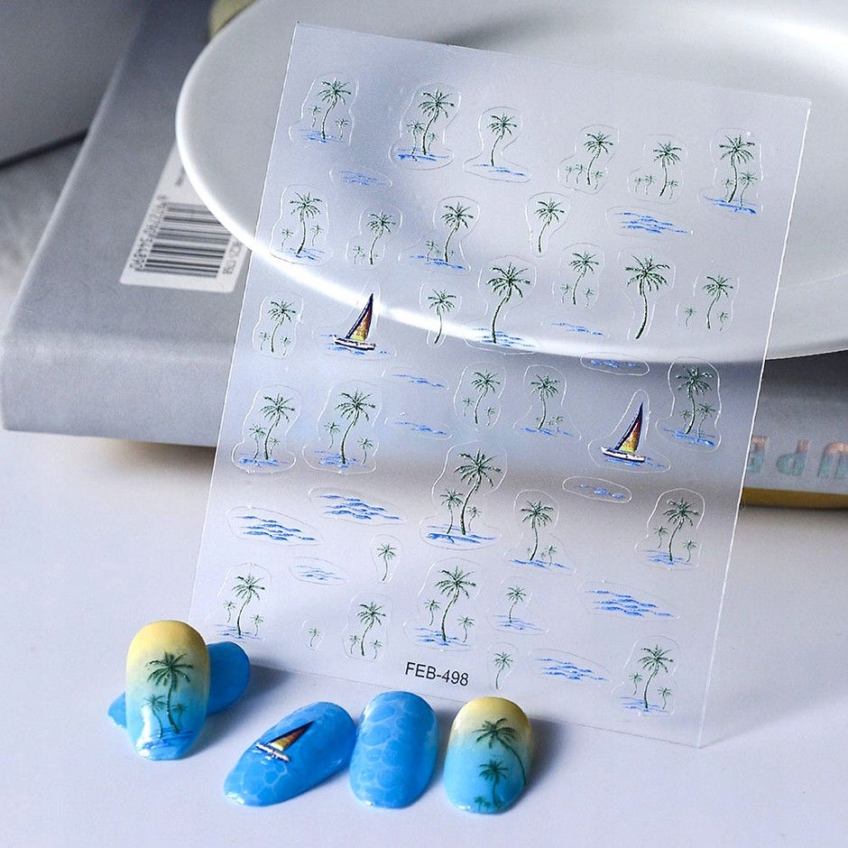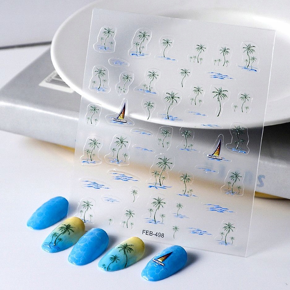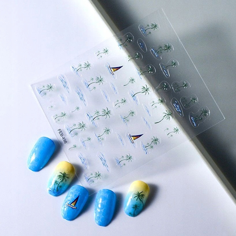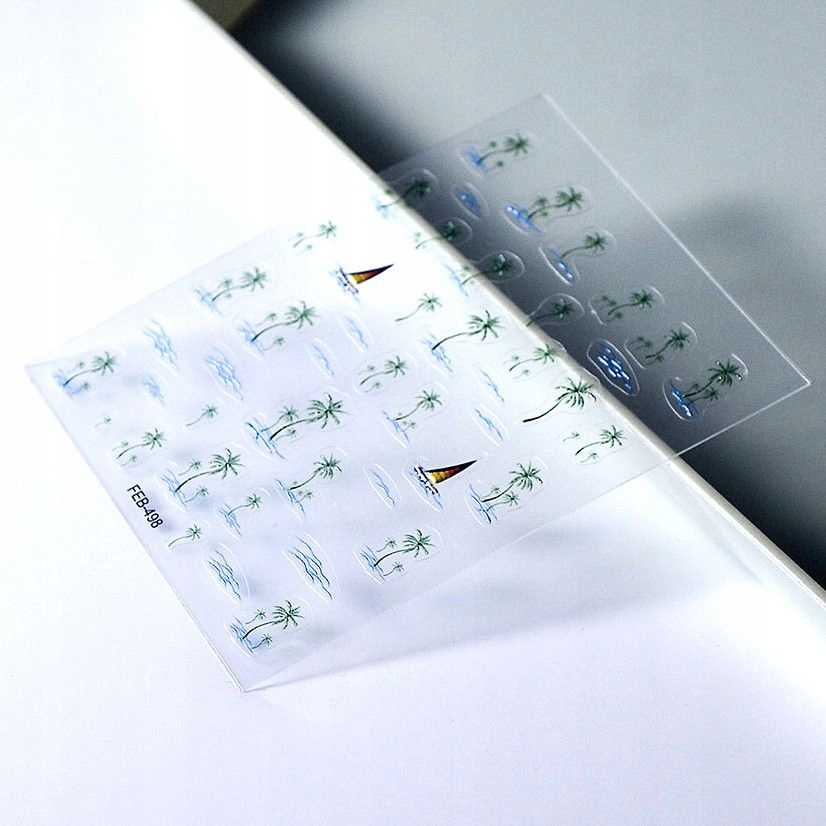 3D nalepke za nohte, samolepilne, konveksne, z vzorci palm, jadrnic, vode Celoten opis
