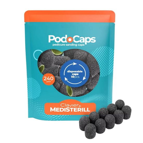 CLAVIER Brusilne kapice za rezkalni stroj PodoCaps 13mm #240 – 10 kosov brusilnih kapic za rezkalni stroj z granulacijo 240# trpežne in učinkovite brusilne kapice enostavno odstranijo otrdelo kožo, na voljo v različnih velikostih brusilne kapice so estetske in skrbno izdelane brusilne kapice za pedikuro so posebni nastavki na koncih naprav, kot so rezkarji ali pile. Njihov glavni namen je povečati higieno med pedikuro. Brusilne kapice MEDISTERILL za pedikuro hitro in nežno odstranijo otrdelo kožo. Zahtevajo majhen pritisk, delo je manj naporno in koža ni toliko obremenjena. Samočistilni učinek zmanjšuje nadležno in nehigienično zamašitev površine brusilne kapice z ostanki kože. Brusilne kapice za rezkalne stroje so na voljo v različnih oblikah in velikostih brusilne kapice MEDISTERILL za pedikuro so na voljo v različnih oblikah in velikostih, da se prilegajo različnim vrstam naprav. Najpogosteje uporabljene kapice so za prste na nogah, na voljo pa so tudi prevleke za pete in stopala. Visokokakovosten material, učinkovitost abrazivnega pokrovčka olajša delo. Brusilni pokrovčki za rezkalne stroje so pripomočki, ki se uporabljajo za poliranje, brušenje, korekcijo in modeliranje nohtov. Zaradi svoje vsestranskosti se ti pokrovčki pogosto uporabljajo v kozmetičnih salonih za izvajanje manikure in pedikure. Izdelani so iz visokokakovostnega brusnega papirja, ki je nameščen na plastični pokrovček, zaradi česar so zelo vzdržljivi, hitro in enostavno jih je mogoče zamenjati. To izboljša udobje dela. Z enim pokrovčkom lahko delamo na dveh parih stopal. Priporočljivo je, da pedikuro opravite vsake 4–6 tednov, da ohranite zdravje, estetiko stopal v dobrem stanju in ves čas uživate v popolnoma gladkih stopalih!
