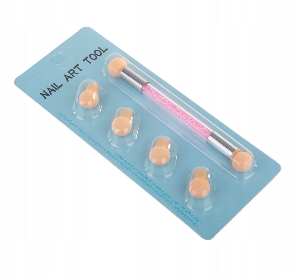 Dvostranski čopič z gobico za ombre s cirkoni – roza cirkoni Bi radi ustvarili popoln brezhiben preliv z idealnimi barvnimi prehodi? Priročen čopič z zamenljivimi gobicami za natančen nanos različnih vrst gelov, hibridov in njihovo senčenje, pa tudi za nanašanje pudrov! To je praktično orodje, ki ga lahko uporabite na različne načine za poslikavo nohtov! Hitro in enostavno lahko ustvarite ombre, babyboomer, večbarvno senčenje. Komplet vsebuje čopič z 2 konicama in kar 4 zamenljive gobice, kar skupaj da 6 gobic. Tri od njih so zaključene s ‚kljunom‘, zahvaljujoč kateremu lahko dosežete vse kotičke in težko dostopna mesta v bližini obnohtne kožice. Ostale tri so okrogle, klasične. Gobice so visoke kakovosti, izjemno mehke z nizko vpojnostjo izdelkov, kar vam bo prihranilo izdelek in denar. Čistite jih lahko s čistilom, pri uporabi za pudre pa je dovolj milnica. To bo zagotovilo daljšo življenjsko dobo čopiča.
